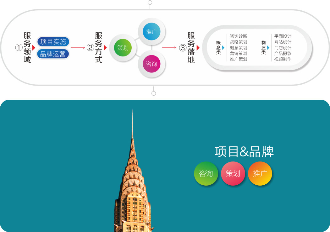 我们提供:项目全程策划、推广。营销一站式的活儿我们全得干!为了养家糊口,这些手艺活儿我们也得干:LOGO设计、VI设计、门户网站。